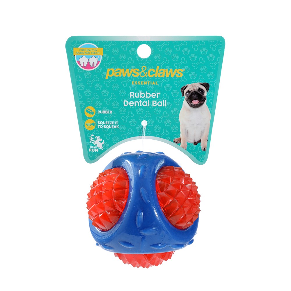 Keep your furry friends entertained for hours with our Paws & Claws DENTAL BALL Dog Toy. Designed to help keep teeth and gums clean and healthy, this textured ball also features a fun squeak when squeezed to encourage active play. Perfect for chewing, chasing, and interactive fun your dog will love.