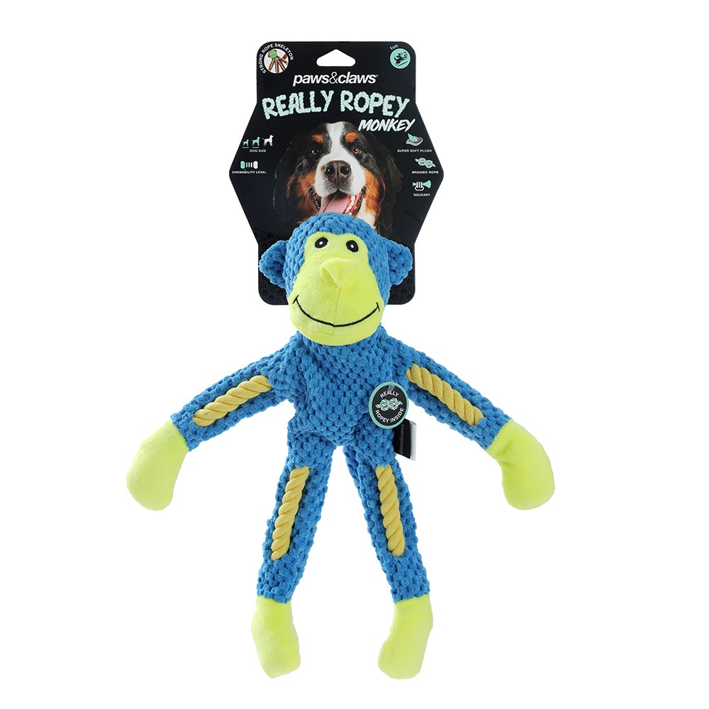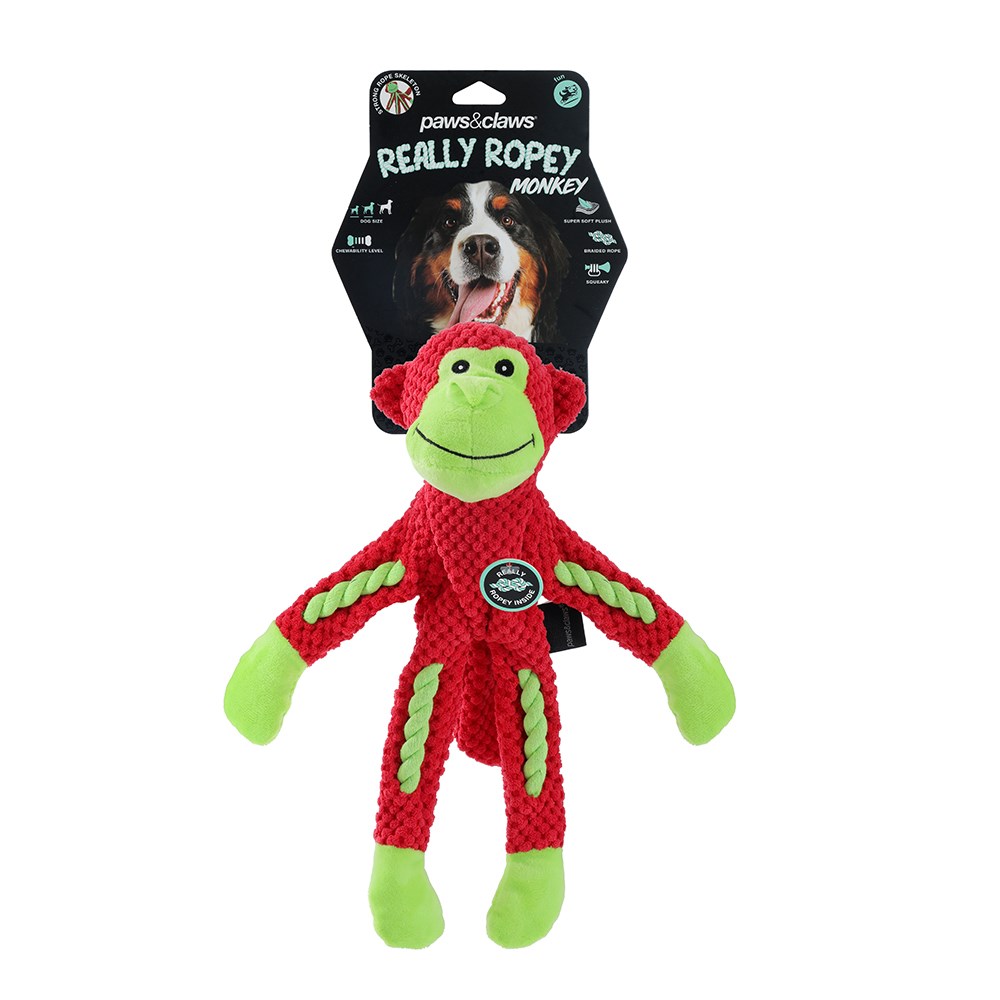 Keep your furry friends entertained for hours with our Paws & Claws Really Ropey Monkey Dog Toy. This plush monkey features a durable rope skeleton inside for added strength and satisfying chew time, making it perfect for tugging, tossing, and cuddling. A fun and engaging toy that combines soft plush comfort with rugged play appeal.