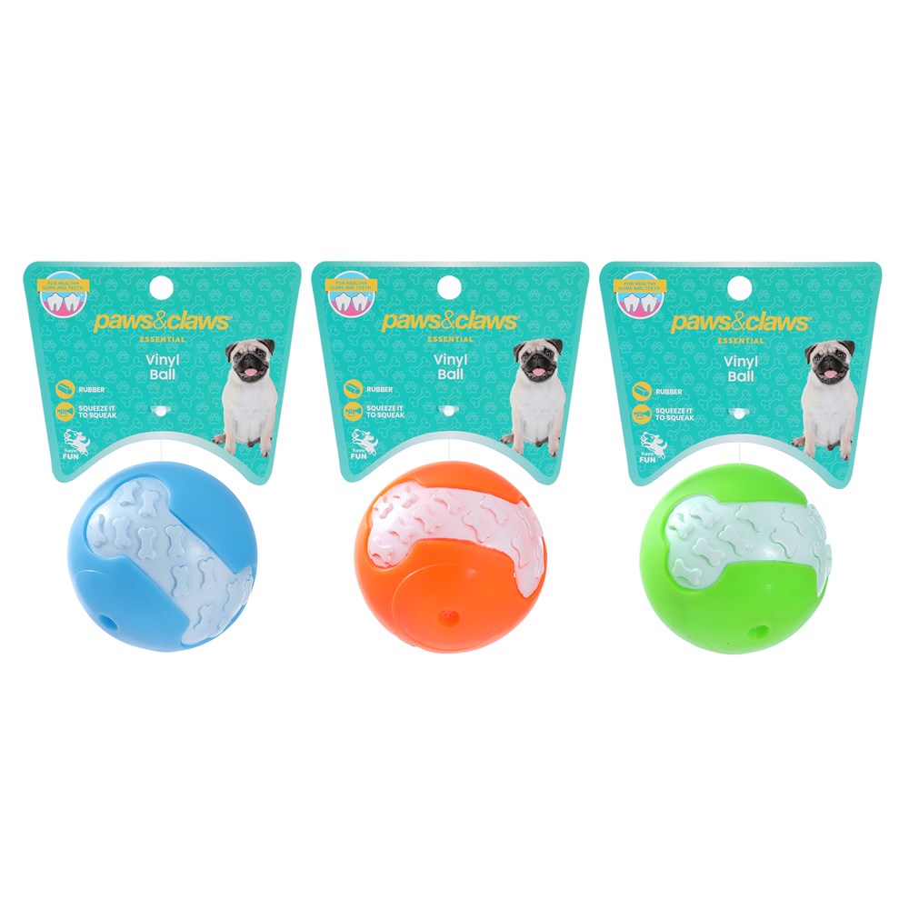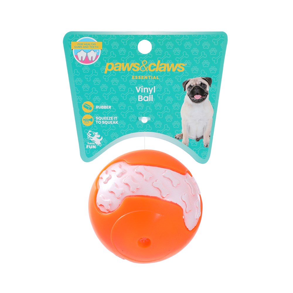 Keep your furry friends entertained for hours with our Paws & Claws Vinyl Dog Toy. Designed to help keep teeth and gums clean and healthy, this textured ball also features a fun squeak when squeezed to encourage active play. Perfect for chewing, chasing, and interactive fun your dog will love.