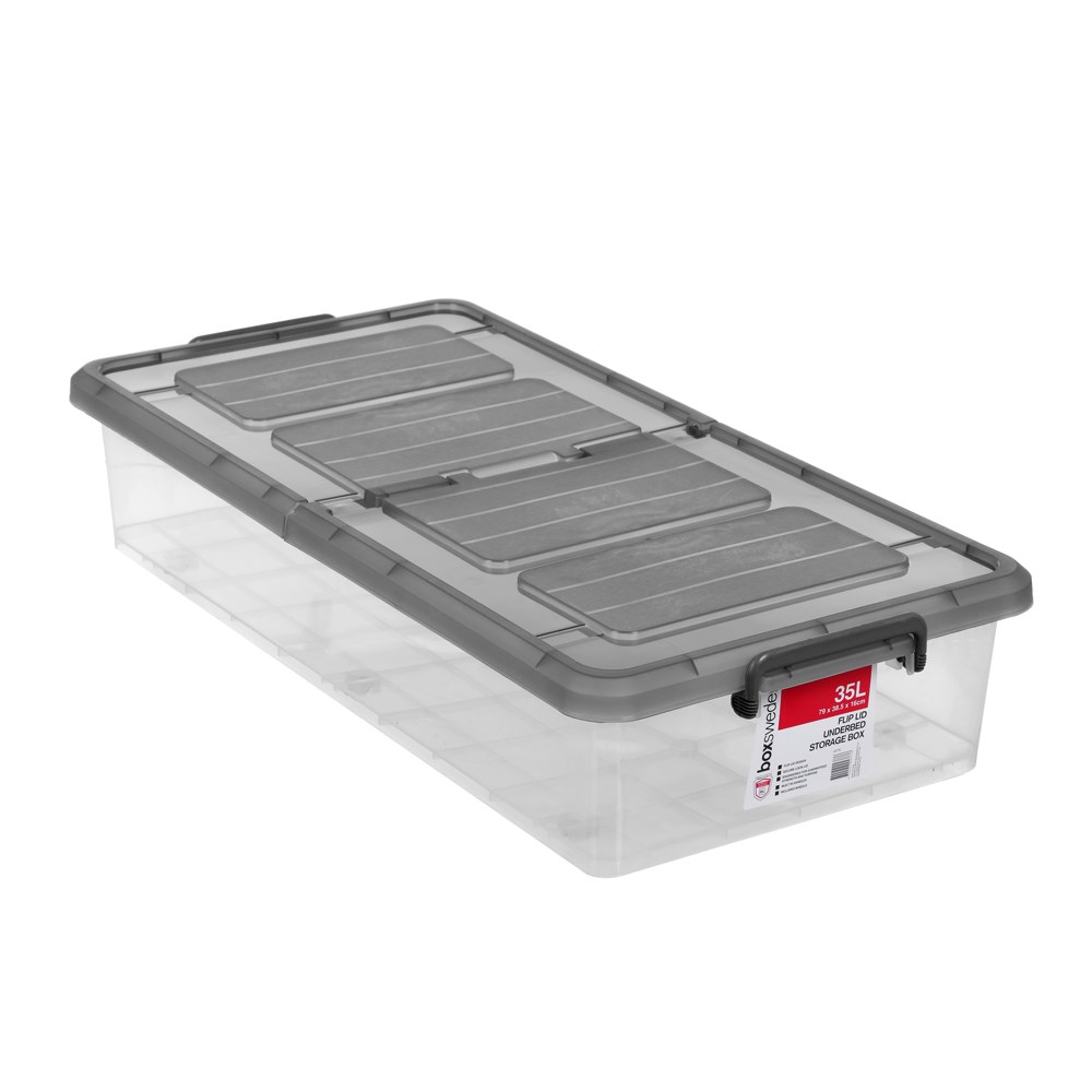 Store away and organise your items with our 35 Litre Boxsweden Underbed Storage Box. Our design is fitted with wheels for easy to move mobility and features a transparent view for uncompromised visibility of the contents, clip lock sides to ensure your storage is kept safe and secure, and has a convenient flip lid for easy access to your storage.